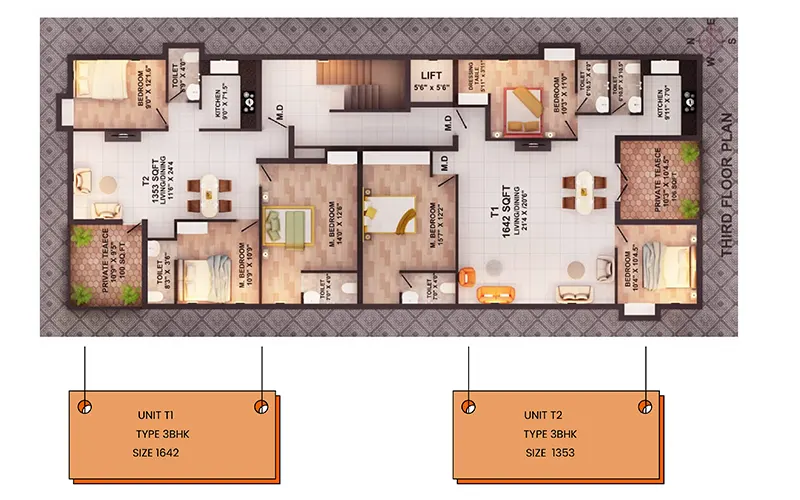 | T1 | 3BHK | 1642 sqft | North | Available |