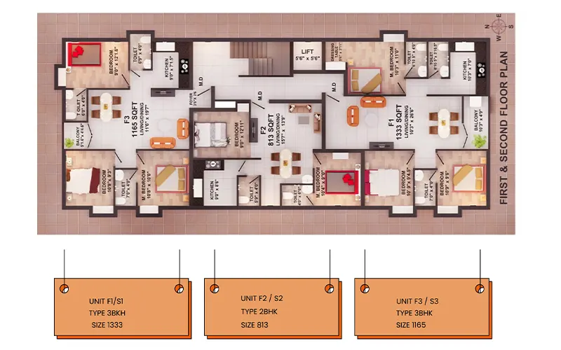 | F1 | 3BHK | 1333 sqft | East | Sold |